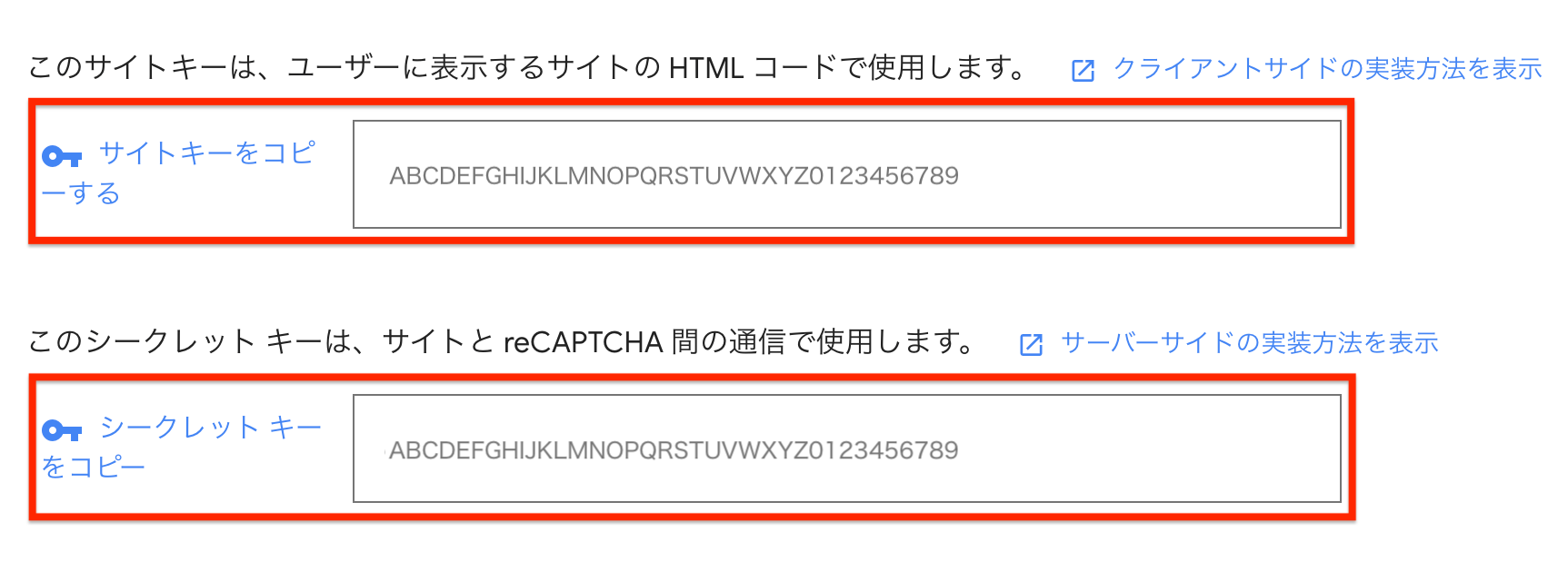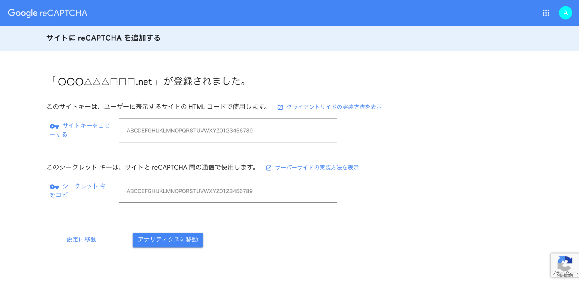 あとはこの2つをContact Form 7の方で貼り付けるだけなのでこのページは閉じても構いませんが、その場合は2つのキーをどこかにメモしておきましょう。