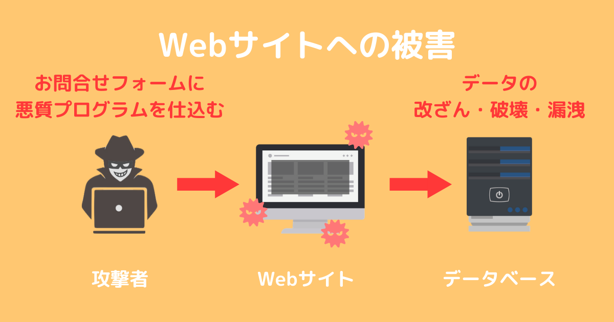 これをWebサイトがフォームを受理してデータベースに保存する際にプログラムが起動し、データベース内のデータを書き換えたり、個人情報などの重要な情報を漏洩させたりします。