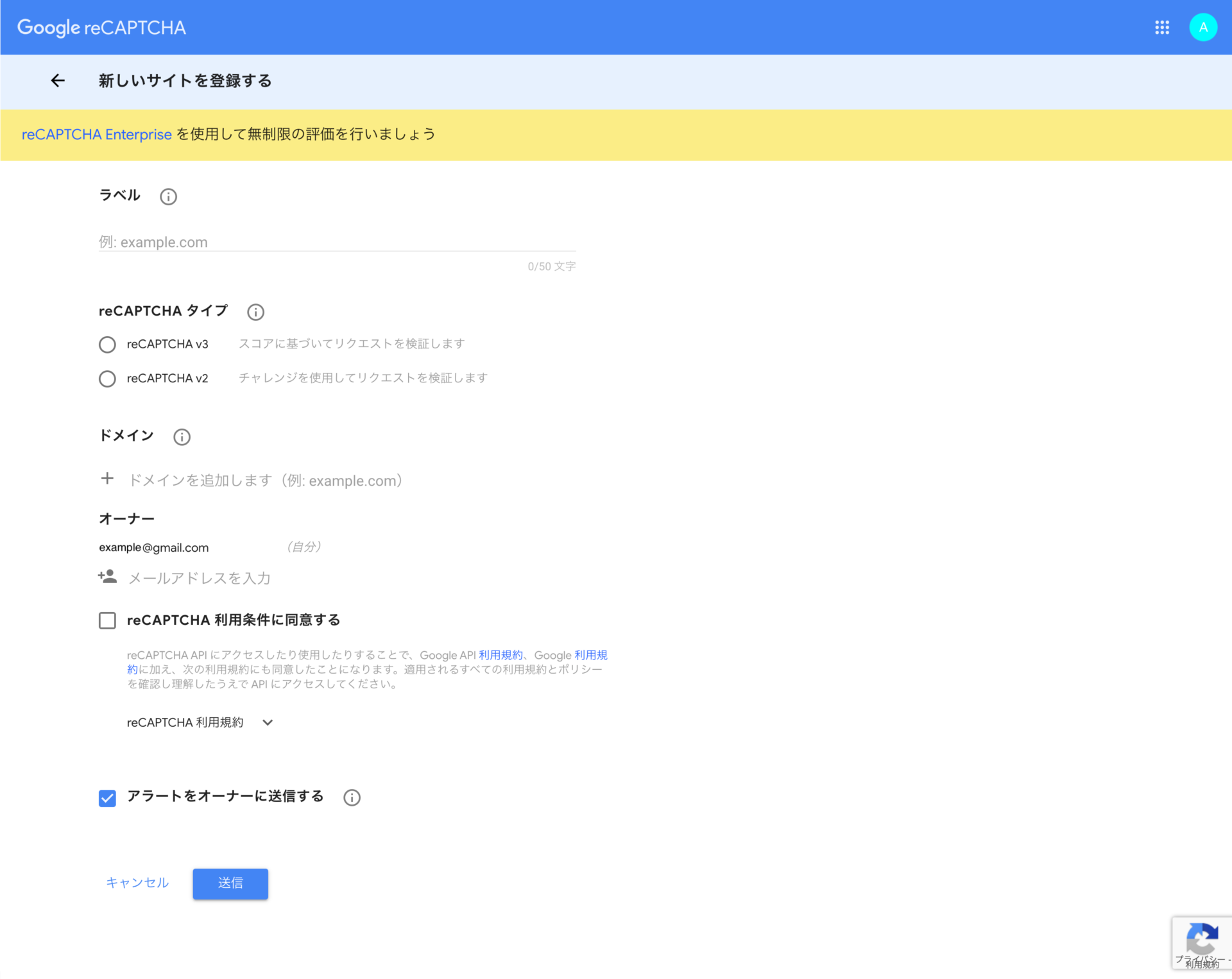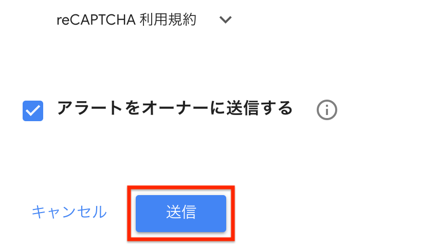 「アラートをオーナーに送信する」にチェックを入れると、reCAPTCHAがサイト内で不審な問題を発見した場合に先ほど上で確認した「オーナー」に連絡を入れてくれるようになります。