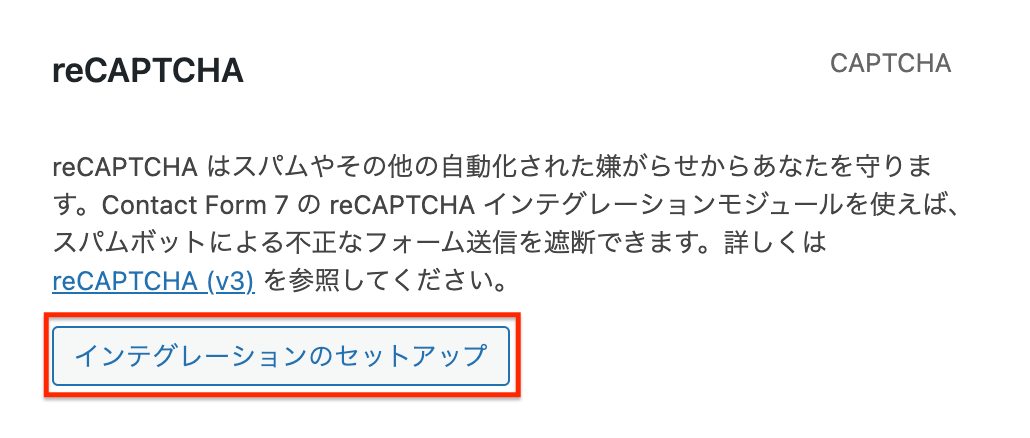 画面真ん中の「reCAPTCHA」から「インテグレーションのセットアップ」をクリックします。