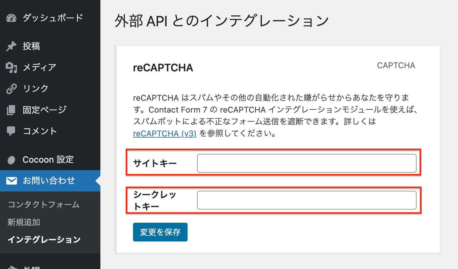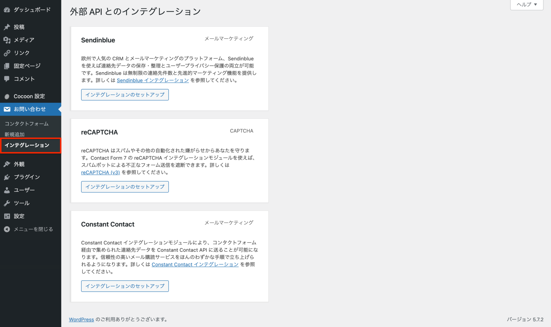 WordPressの管理画面から「 お問い合わせ」→「インテグレーション」