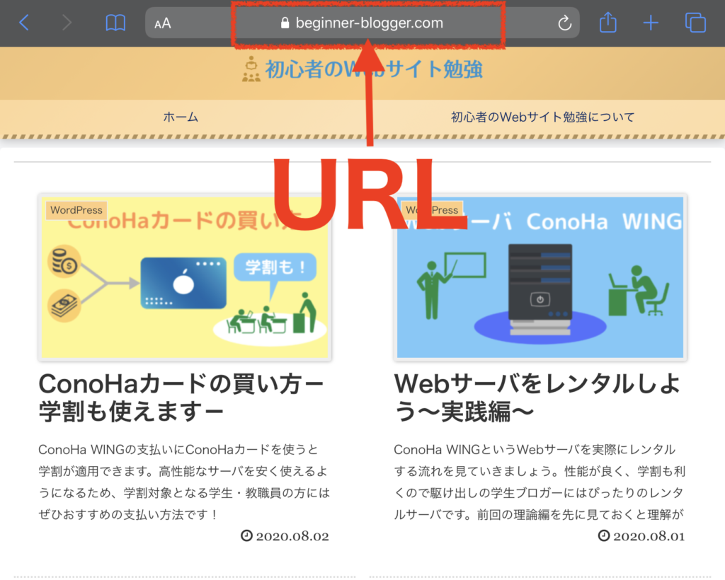これはWebサイトのホームページにアクセスするためのURLですが、それぞれの記事のURLはホームページのURL後ろに新しい文字列がくっついたURLとなります。