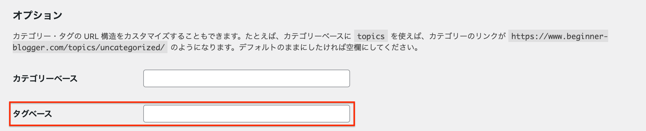 最後はカテゴリーとタグのオプションについてです。カテゴリーベースとタグベースと呼ばれる部分をカスタマイズすることができます。