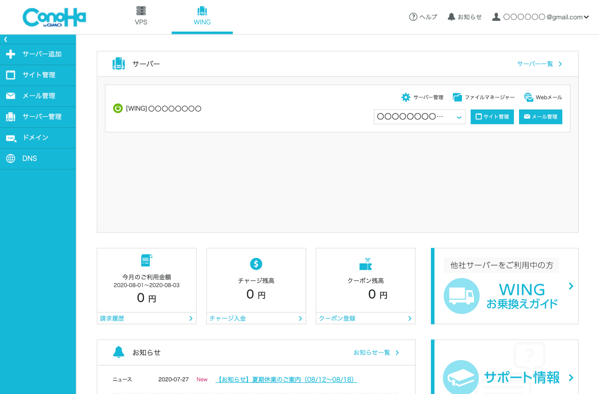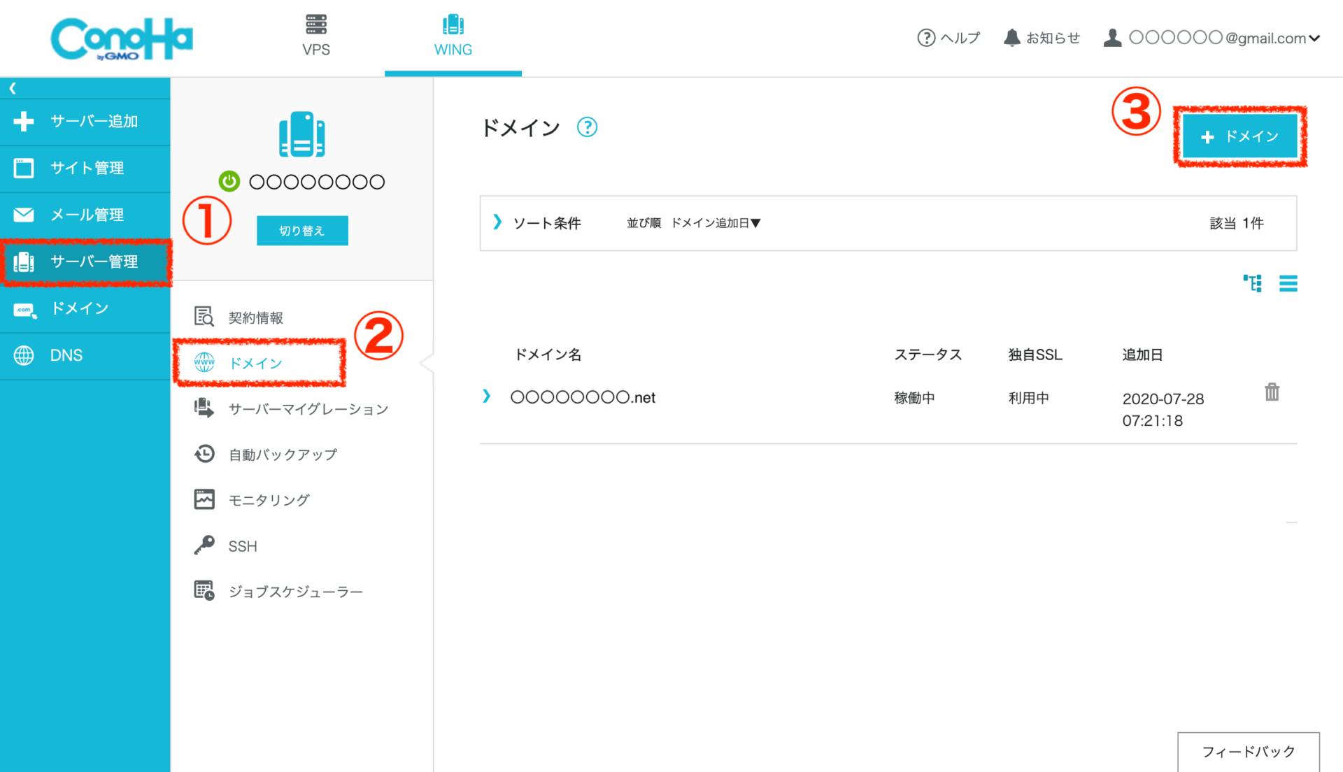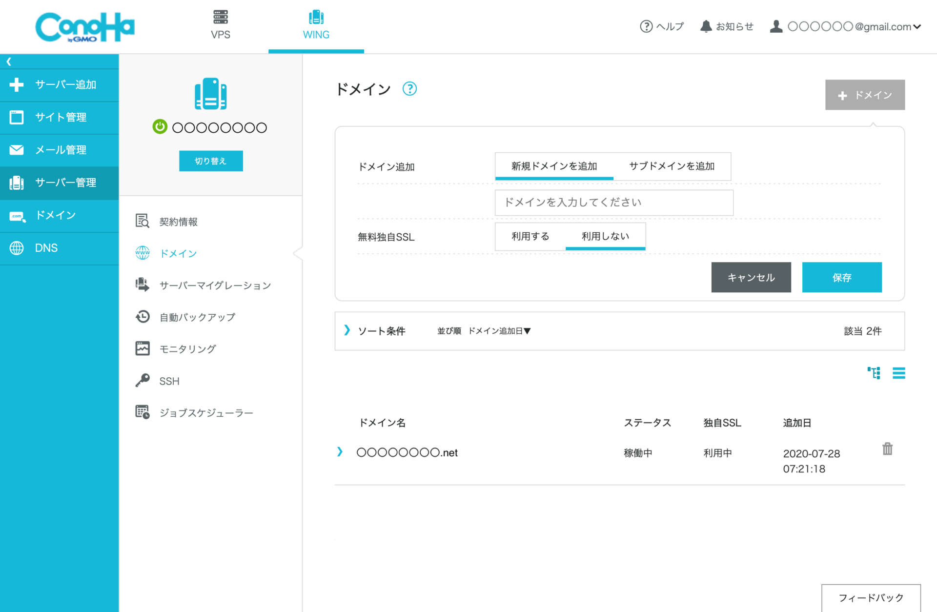 ここで一旦ConoHaの管理画面での作業に移ります。Google Domainsの画面は開いたままにしておきましょう。
