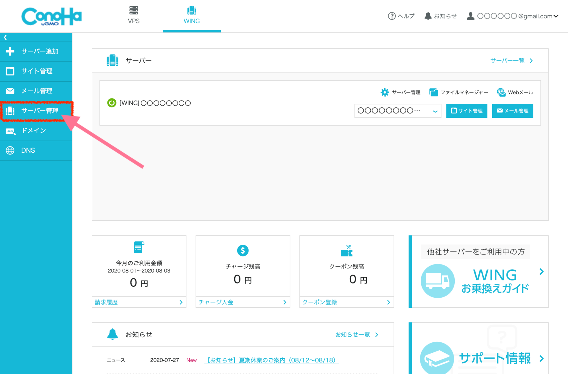画面左の「サーバー管理」をクリックしましょう。画面が切り替わります。