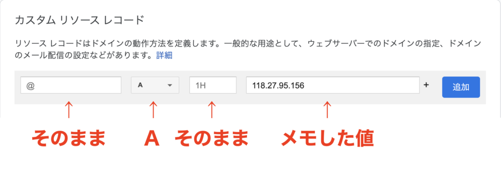 画像のように入力して「追加」を押しましょう。「@」と「1H」と書いてある欄はそのまま何も入力しなくて大丈夫です。値とは、先ほどメモしたIPアドレスのことです。
