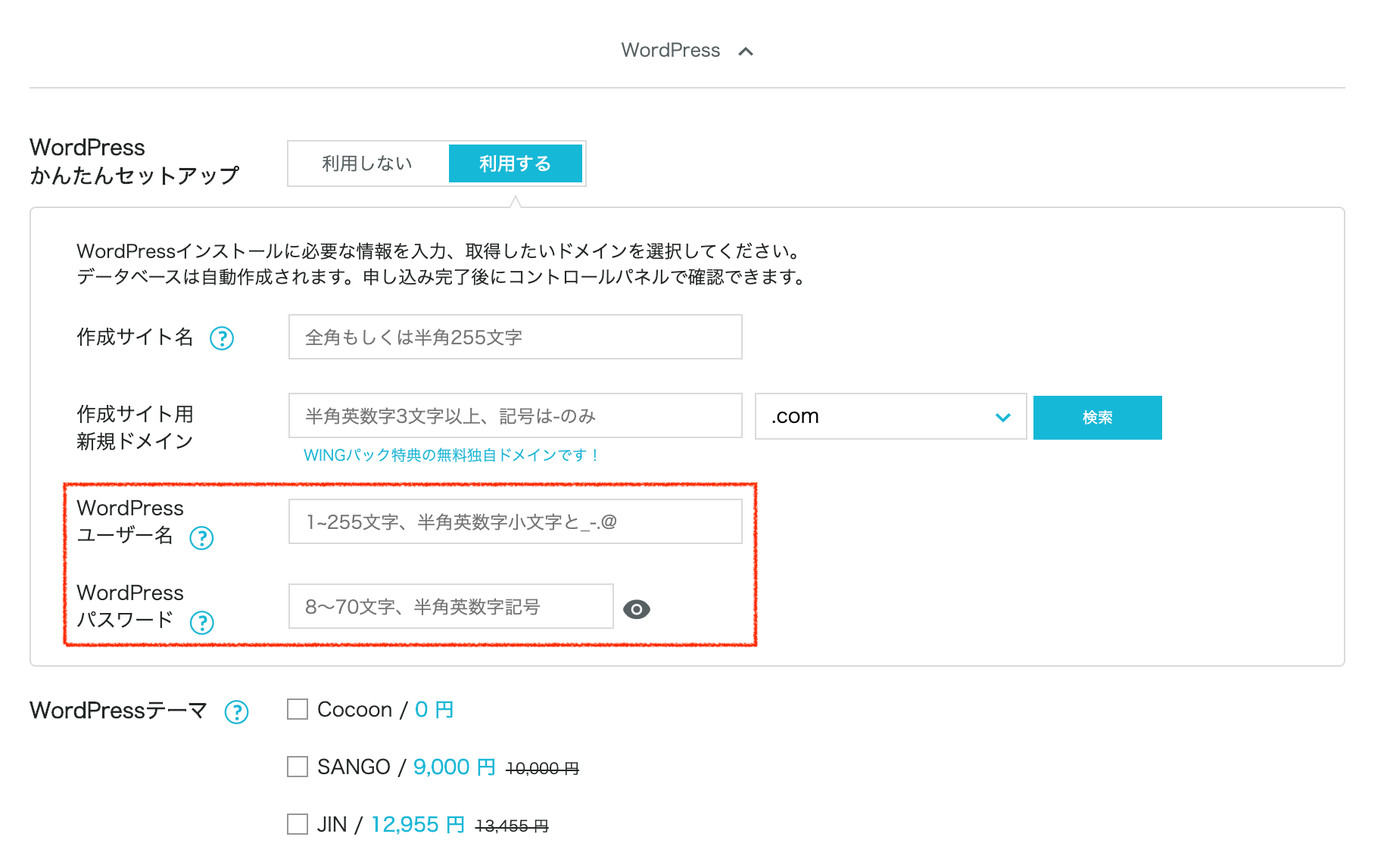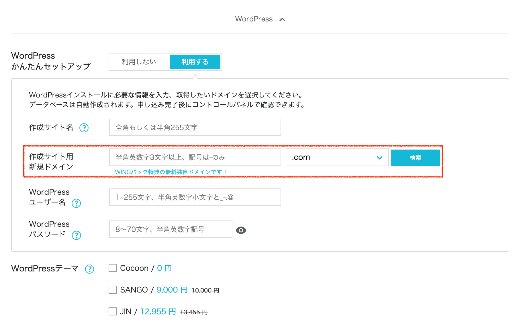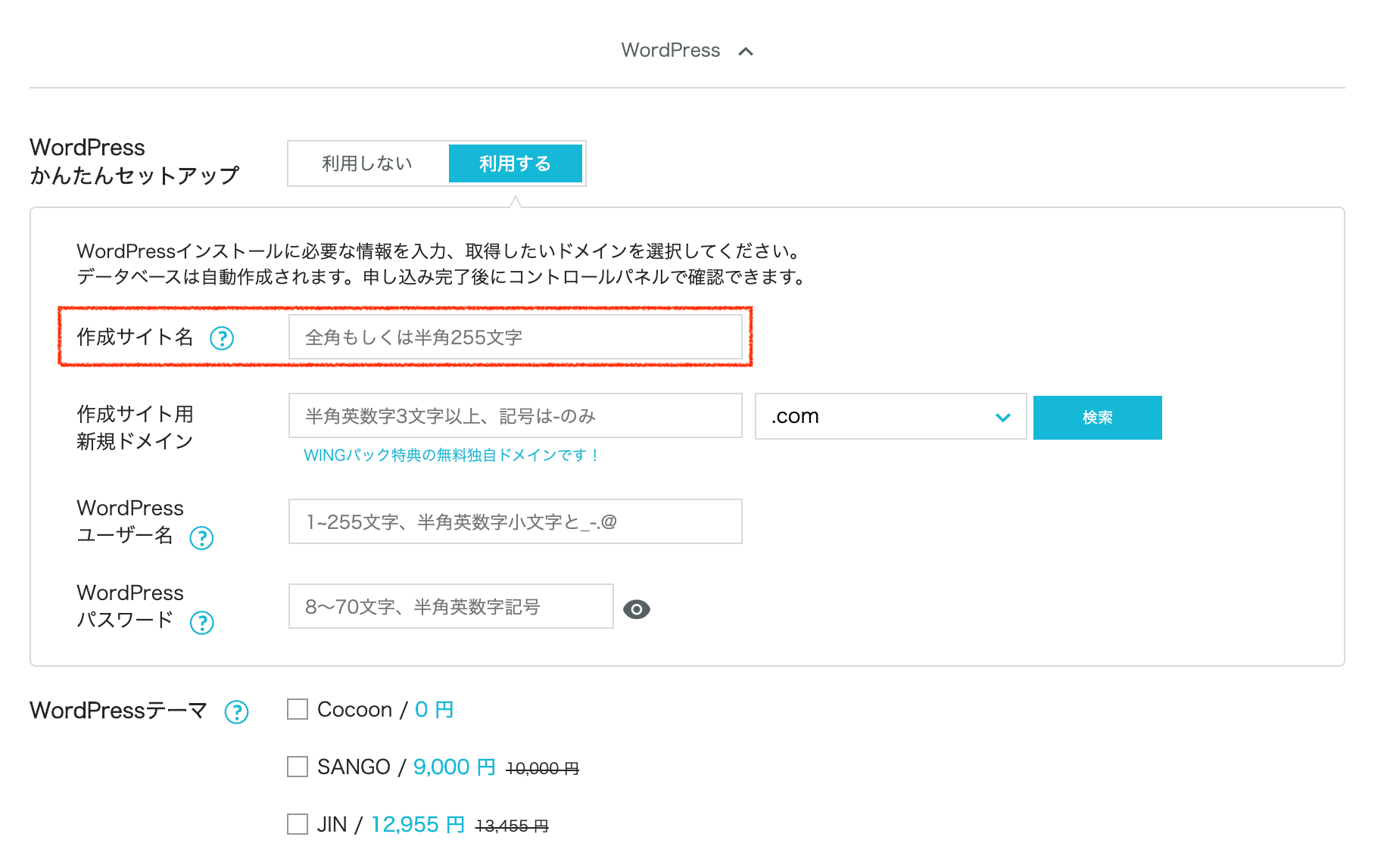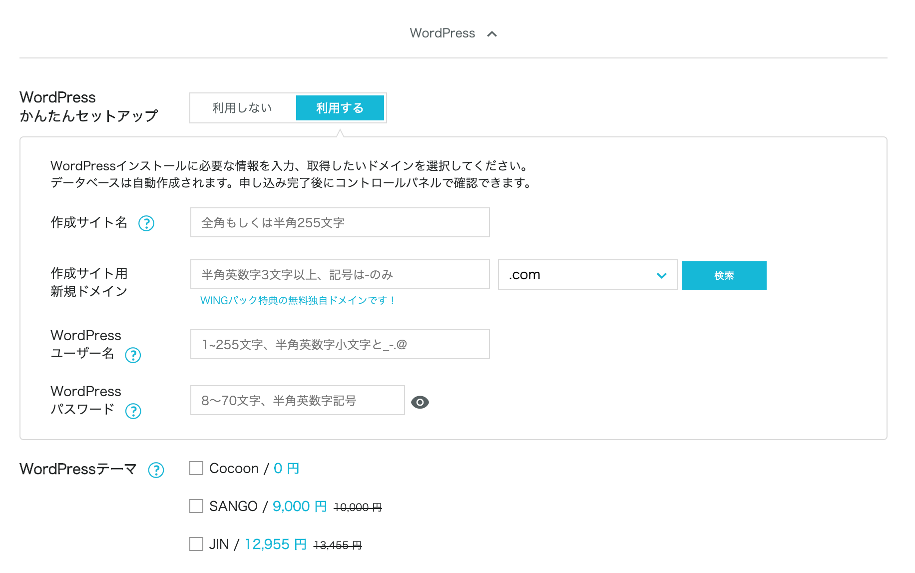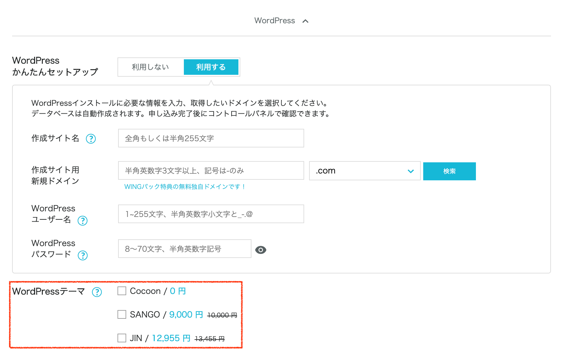ConoHa WINGをWINGパックで申し込んだ場合、プラン選択の画面でWordPressかんたんセットアップというオプションを選択することができます。