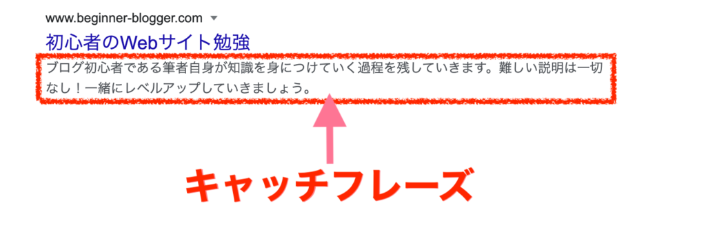通常は、画像のように検索結果でWebサイトの説明として表示されます。この説明を読んでユーザーはサイトを訪れるかどうかを決めるため、集客の観点からは非常に重要な部分だと言えます。しかし、今はこのキャッチフレーズの部分には何も入力せず、空白にしましょう。
