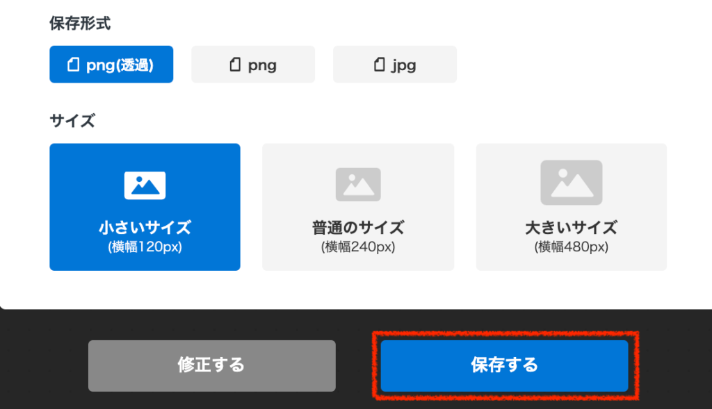 保存形式は、PNG(背景透過)、PNG、JPG の3つから選ぶことができます。