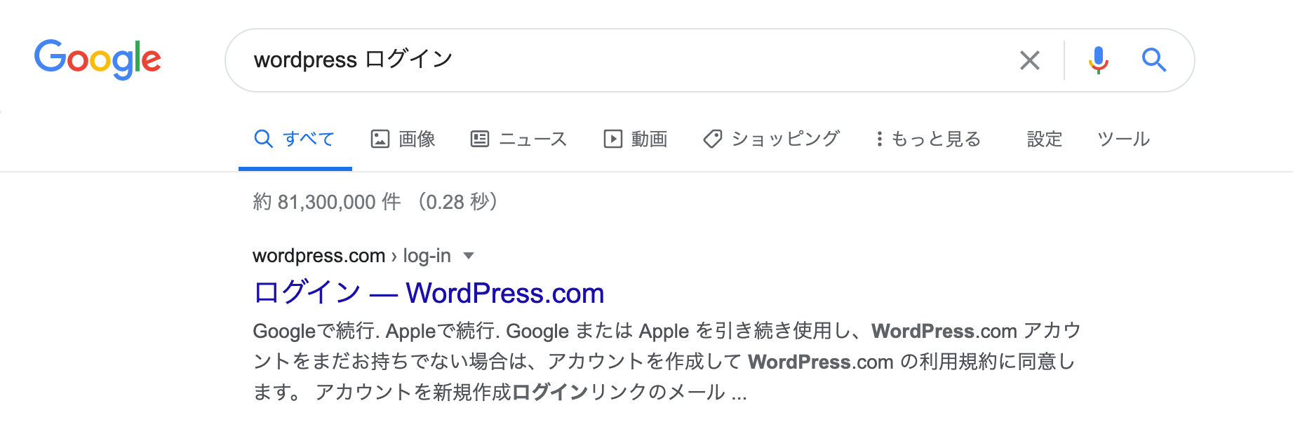 Googleなどで「WordPress ログイン」と検索すると、以下のような結果が表示されます。