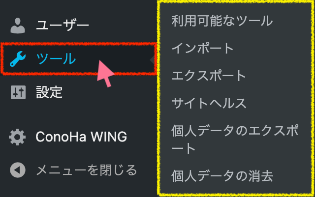 サイドメニューの「ツール」にカーソルを当てると、サブメニューが現れます。