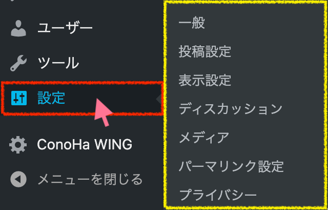 サイドメニューの「設定」にカーソルを当てると、サブメニューが現れます。