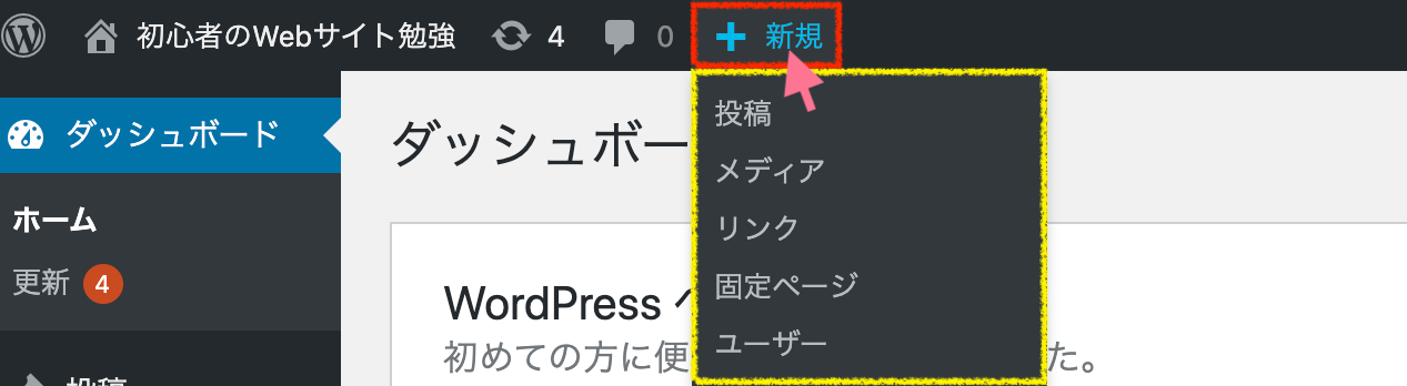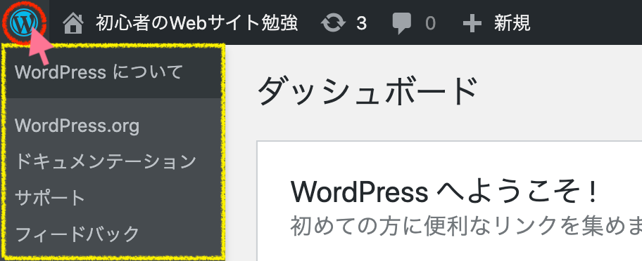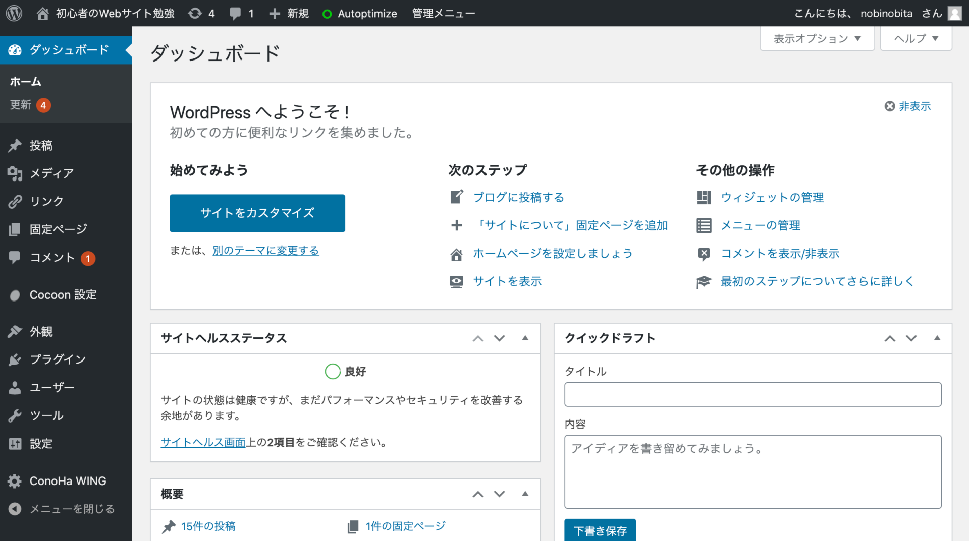 WordPressの設定や記事の投稿など、基本的なことはすべてこのダッシュボードから行います。