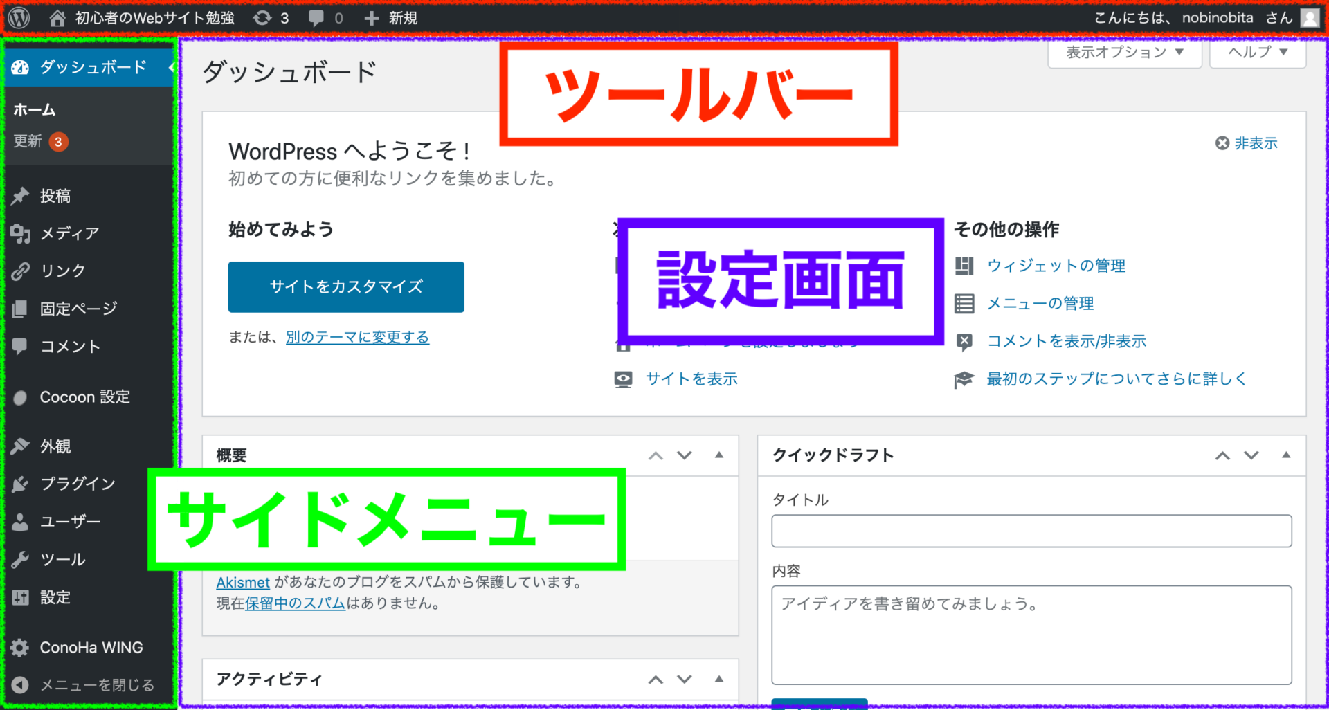 - WordPressの管理画面はツールバーとサイドメニューの2つで設定する内容を選択します。